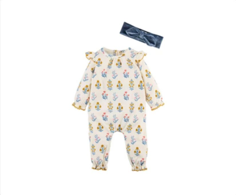 Corduroy one-piece with ruffle shoulders and inner leg snap closure.